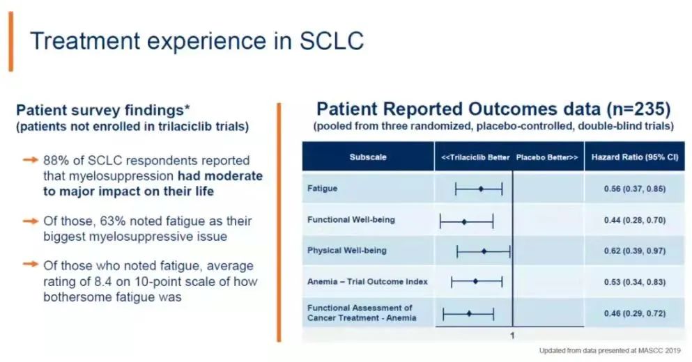 2021 年 2 月,曲拉西利获 FDA 批准上市。这项批准基于 3 项双盲、安慰剂对照 II 期临床试验,共纳入 235 例广泛期小细胞肺癌患者,接受抗肿瘤治疗的同时分别随机接受曲拉西利或者安慰剂治疗,其中化疗方案分别为依托泊苷+卡铂一线治疗、依托泊苷+卡铂+阿替利珠单抗一线治疗、拓扑替康二/三线治疗。