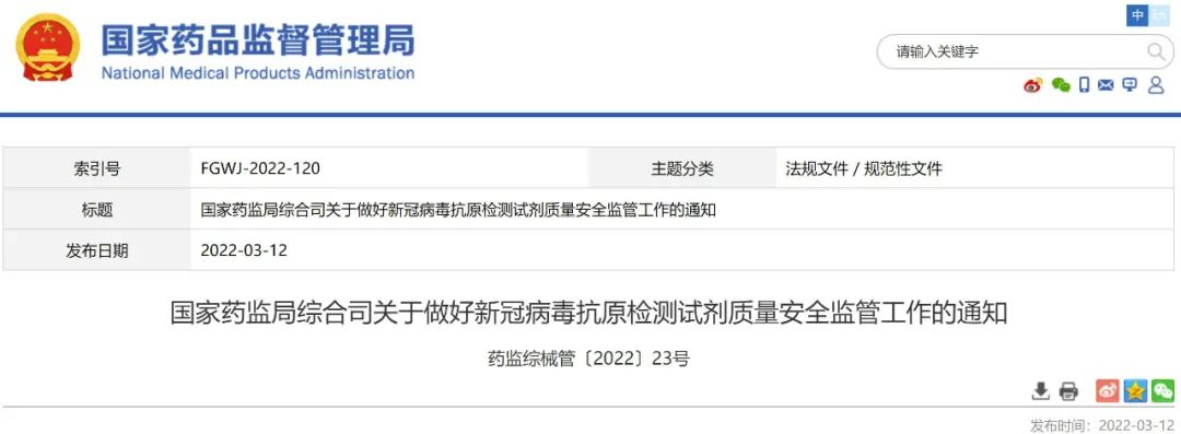 国家药监局紧急发布通知,规范新冠病毒抗原检测试剂研发、生产和销售