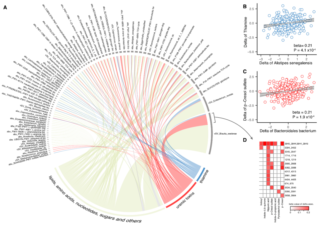 除菌株层面变化外,肠道微生物的含量,特定遗传组成等变化也与血浆代谢物广泛相关,特别是与尿毒素及硫胺素等与心血管病及慢性肾病相关的代谢物