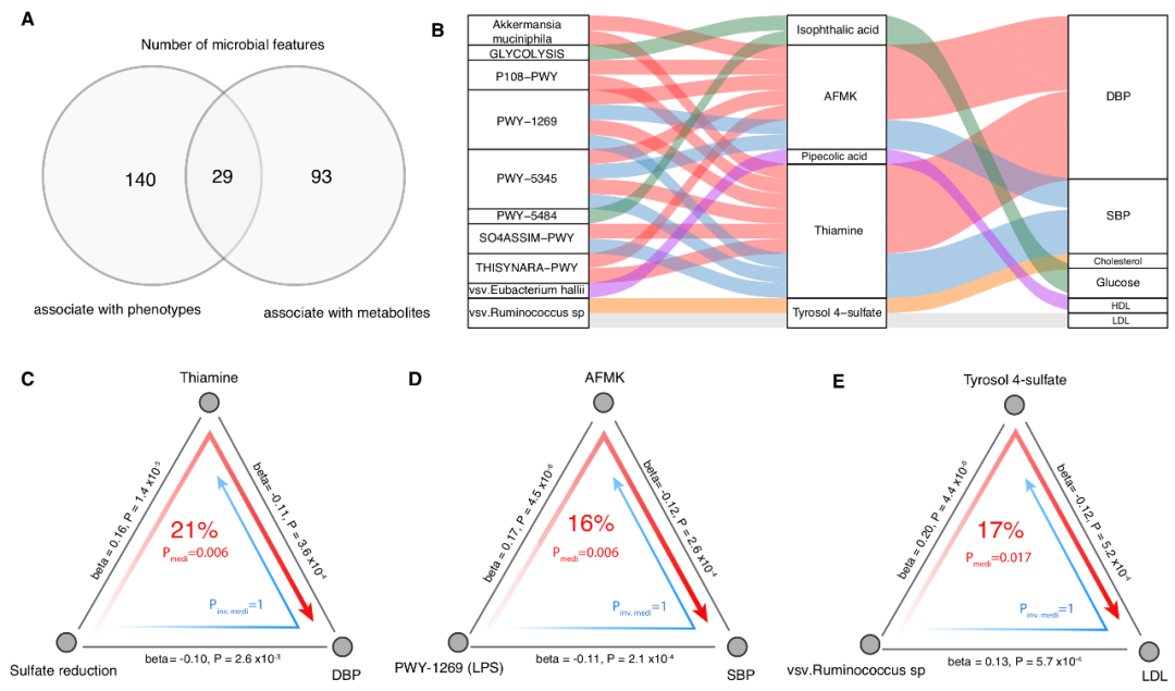 研究人员进一步通过双向中介分析揭示了肠道微生物通过其代谢物影响宿主血压、血糖及血脂等心血管病指标