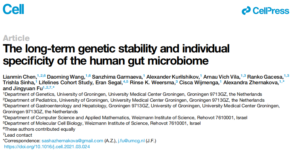 该团队陈连民、王道明博士等通过Lifelines随访队列,探索了个体四年间肠道微生物组成的稳定性,发现部分肠道微生物的遗传构成具有个体特异性,并利用这一特征针对性地开发了高精度肠道微生物指纹算法,