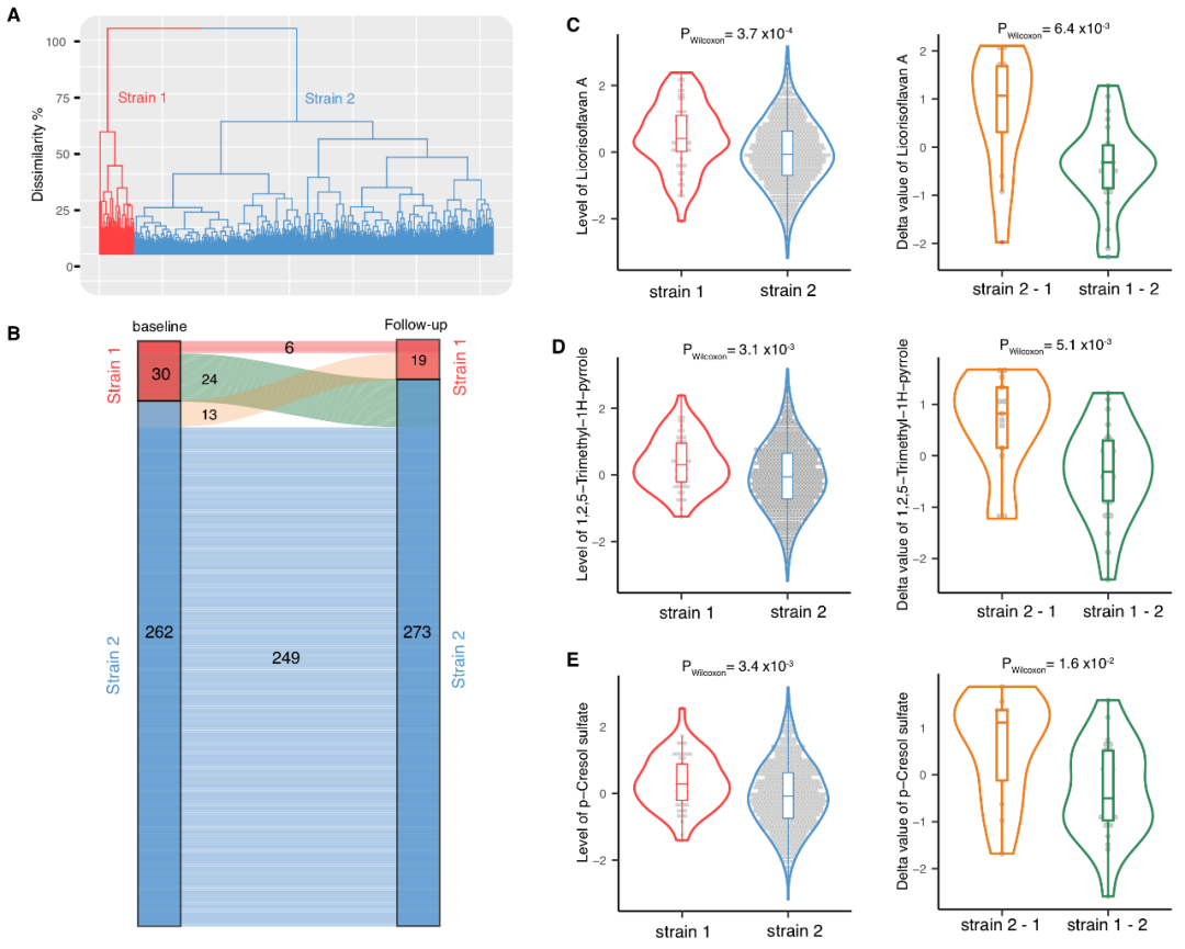 进一步地,将肠道微生物变化与血浆代谢物相关联,发现一些个体肠道中细菌菌株的改变与血浆代谢物变化相关。例如,个体肠道中益生菌Faecalibacterium prausnitzii菌株的变化与其血浆中多种心血管病相关的代谢物浓度变化相关