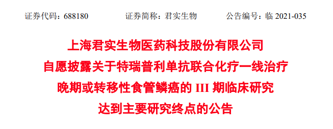 4 月 22 日,君实生物发布公告,特瑞普利单抗联合紫杉醇/顺铂一线治疗晚期或转移性食管鳞癌的 III 期临床研究达到主要研究终点,拟近期沟通递交上市申请。