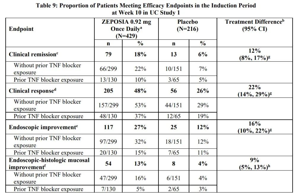 在第10周诱导期间(Zeposia N=429 vs. placebo N=216),试验达到了临床缓解的主要终点(18%vs 6%, p<0.0001)以及主要次要终点,包括临床反应(48%vs 26%,p<0.0001)、内镜改善(27% vs 12%,p<0.0001),Zeposia组和安慰剂组的内镜-组织学粘膜改善率分别为13% vs.4%,(p<0.001)。