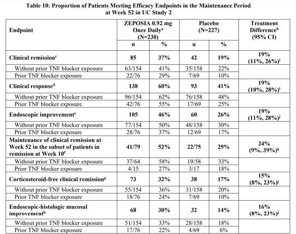 在第52周的维持期间(Zeposia N=230 vs placebo N=22),试验达到了临床缓解的主要终点(37% vs.19%,p<0.0001)以及关键的次要终点,包括临床反应(60% vs.41%,p<0.0001)、内镜改善(46%vs. 26%,p<0.001)、无皮质类固醇临床缓解(32% vs. 17%),Zeposia组和安慰剂组的粘膜-组织学改善率分别为30%和14%(p<0.001)。