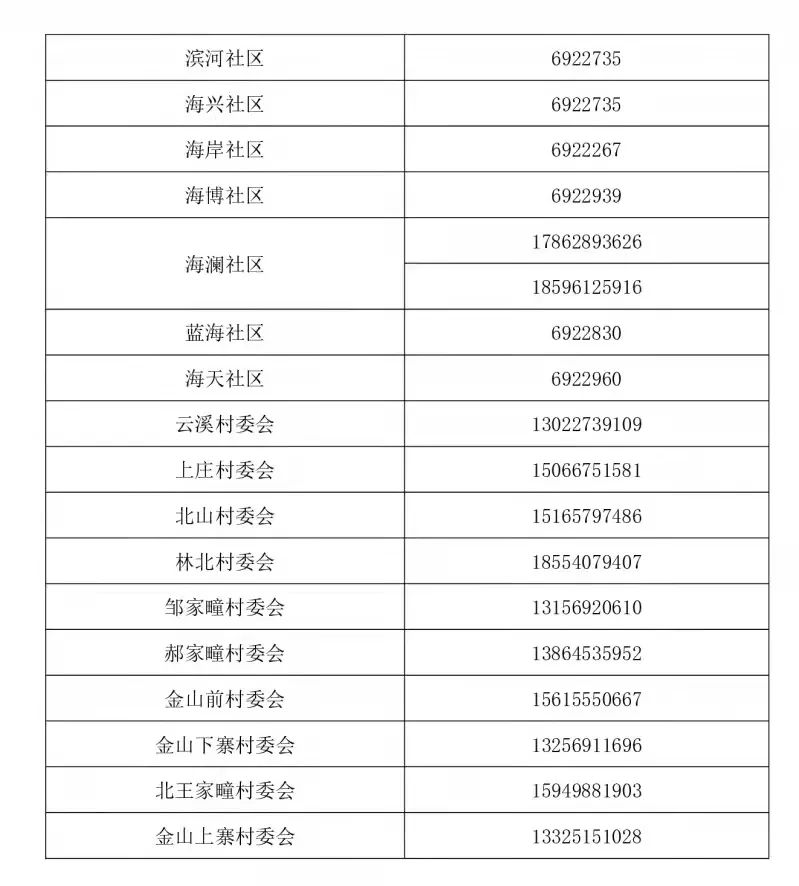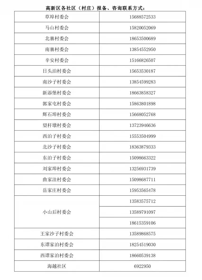 高新区各社区(村庄)报备、咨询联系方式: