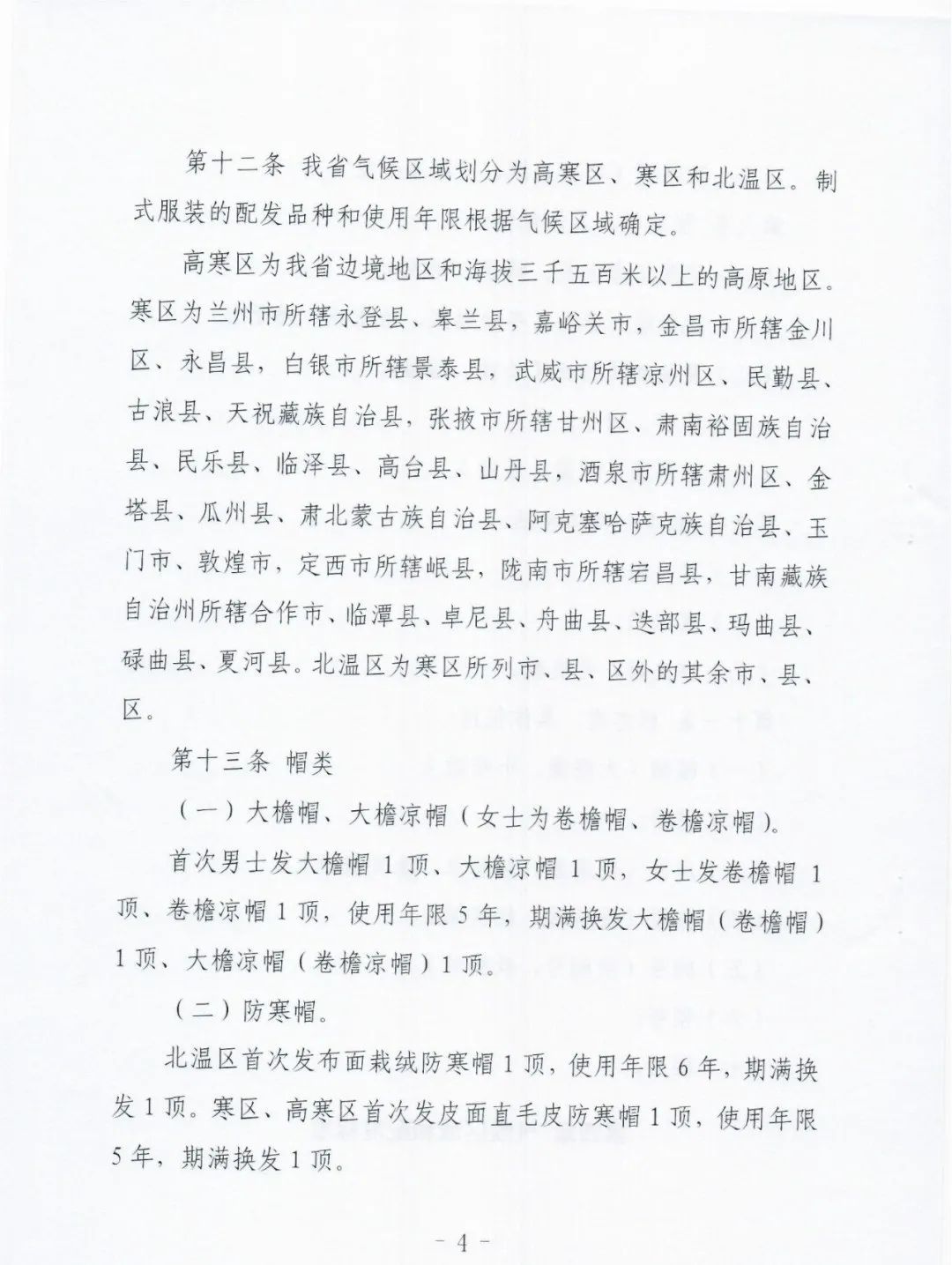 三是保留了特殊地区服装品种选择权。因制式服装的配发品种和使用年限与气候区域紧密关联,为满足我省北温区内高原地区综合执法着装需要,我们在按行政区域划分气候区域(寒区和北温区)的基础上,《实施办法》第十二条原文引用两部委办法中对高寒区“边境地区和海拔三千五百米以上的高原地区”规定,保留了我省北温区内海拔三千五百米以上高山地区(临夏州母太子山、陇南市雄黄山、定西市露骨山、兰州市马衔山等)执法人员制式服装品种选择权。