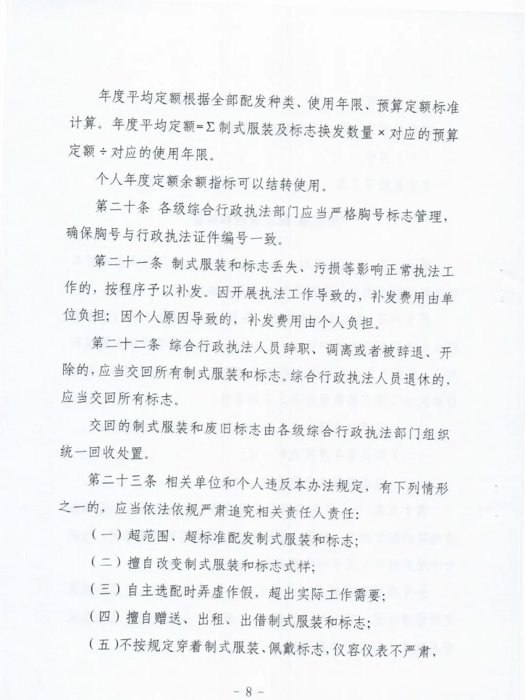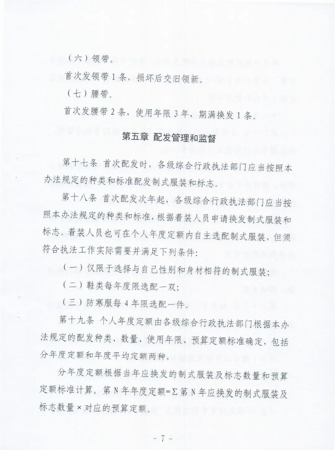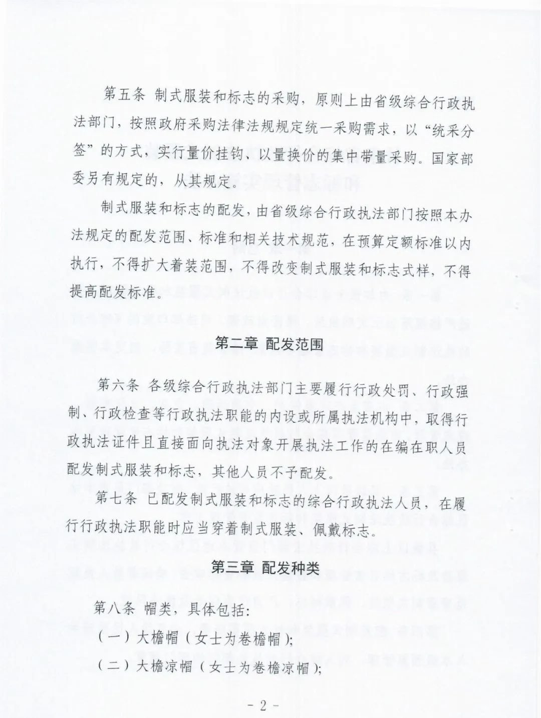 二是明确了采购办法和配发责任。《实施办法》第五条规定,制式服装和标志的采购,原则上由省级综合行政执法部门,按照政府采购法律法规规定统一采购需求,以“统采分签”的方式,实行量价挂钩、以量换价的集中带量采购。国家部委另有规定的,从其规定。制式服装和标志的配发,由省级综合行政执法部门按照本办法规定的配发范围、标准和相关技术规范,在预算定额标准以内执行,不得扩大着装范围,不得改变制式服装和标志式样,不得提高配发标准。