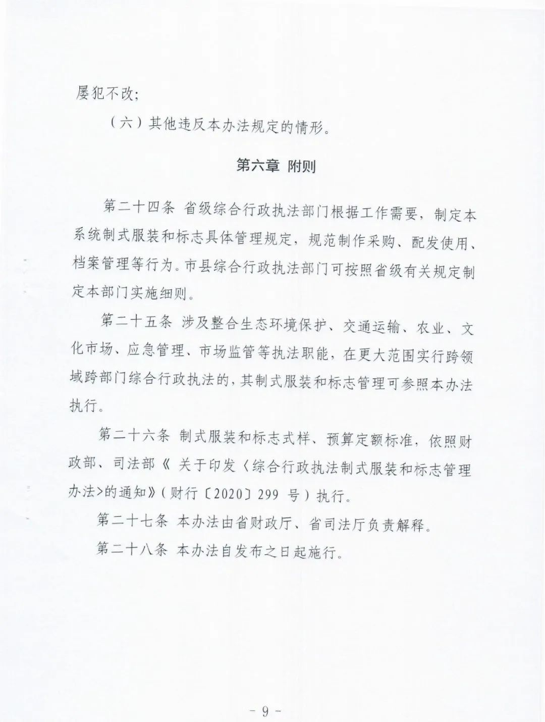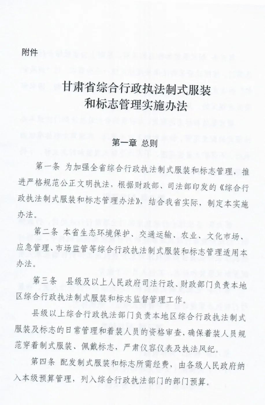 2020年12月9日,经国务院同意,《财政部司法部关于印发〈综合行政执法制式服装和标志管理办法〉的通知》(财行〔2020〕299号)印发执行。为落实管理办法,按照省政府要求,省司法厅会同省财政厅起草了《甘肃省综合行政执法制式服装和标志管理实施办法》。