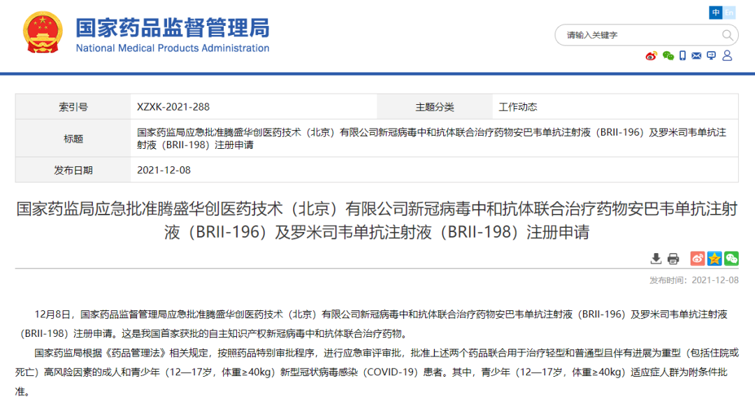 12 月 9 日,腾盛博药宣布,其新冠单克隆中和抗体安巴韦单抗/罗米司韦单抗联合疗法(此前称 BRII-196/BRII-198 联合疗法)获中国药品监督管理局(NMPA)的上市批准,用于治疗轻型和普通型且伴有进展为重型(包括住院或死亡)高风险因素的成人和青少年(12-17 岁,体重≥40 kg)新型冠状病毒感染( COVID-19)患者。其中,青少年(12-17 岁,体重≥40 kg)适应症人群为附条件批准。