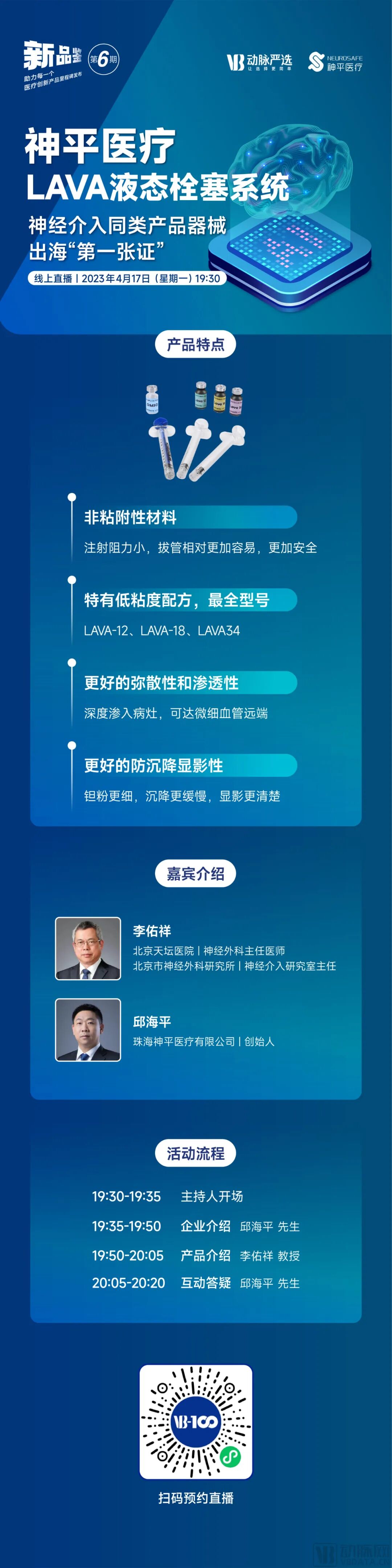 为了让大家有更全面地了解,2023年4月17日 (星期一)19:30-20:30,神平医疗产品LAVA液态栓塞系统将在动脉严选新品鉴进行直播介绍。