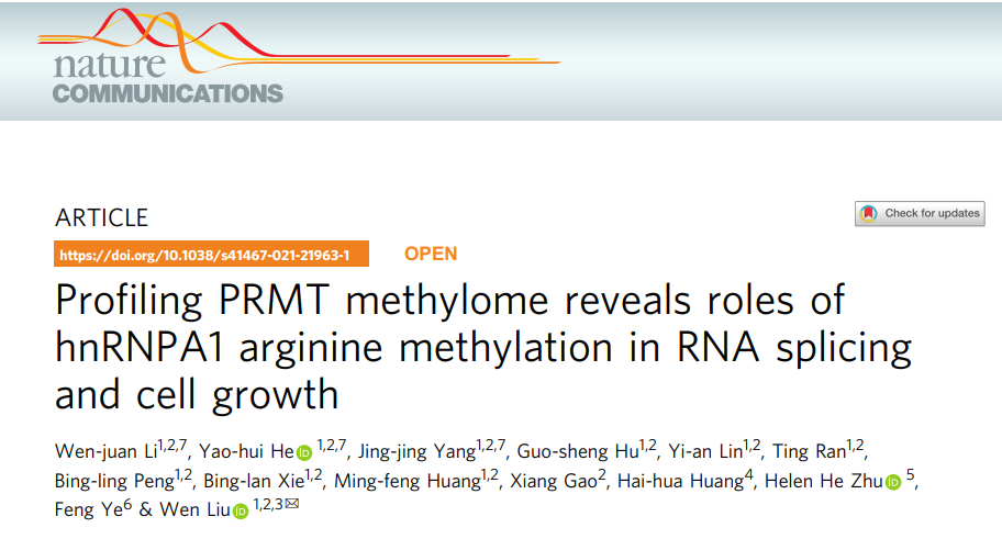 近日,厦门大学细胞应激生物学国家重点实验室,厦门大学药学院刘文教授团队在Nature Communications杂志上发表论文: Profiling PRMT methylome reveals roles of hnRNPA1 arginine methylation in RNA splicing and cell growth,揭示了精氨酸甲基转移酶家族蛋白介导的精氨酸甲基化修饰网络及其协同调控基因剪接和促癌机制。
