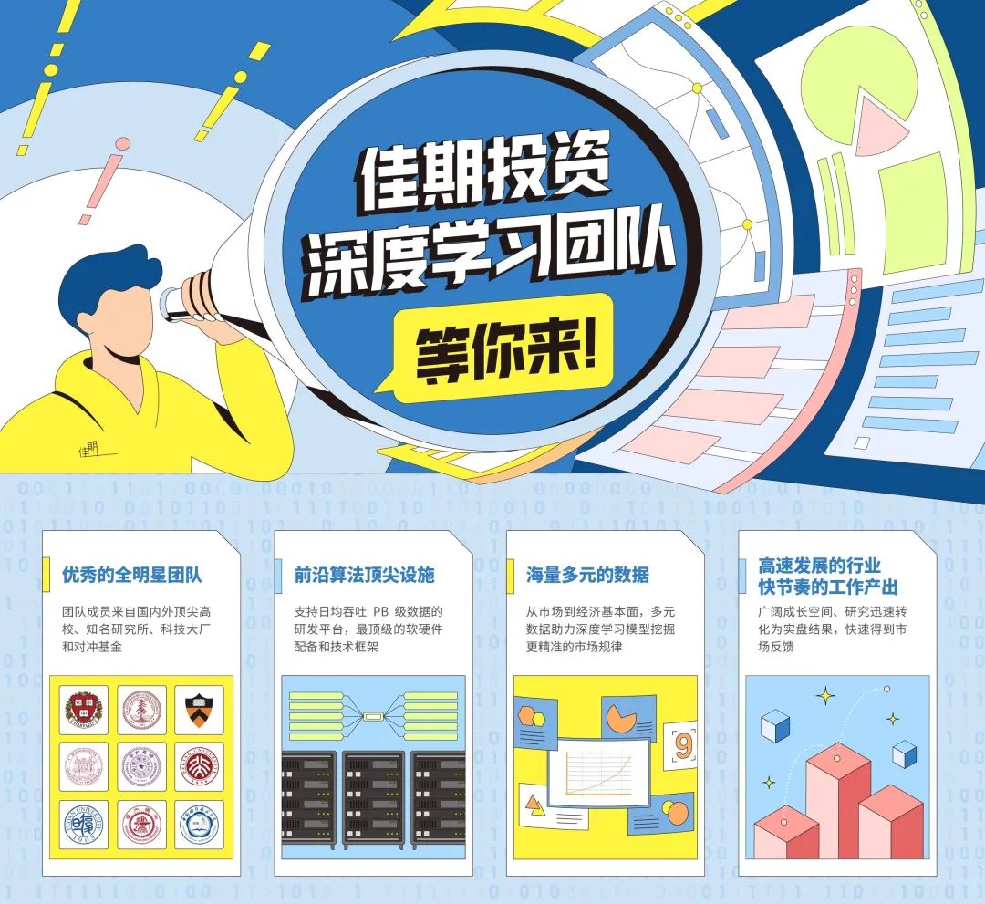 深度学习团队是佳期的核心驱动力之一。我们持续在快节奏且充满变化和挑战的金融市场中拓展前沿理论和应用,并至今有了多年的积累与实践。这些技术的积累、进化与创新都成为了公司成长和投资回报的核心来源。深度学习研究员充分利用强大的计算资源对海量多元数据进行挖掘、模型结构搭建、训练和推断,在特征提取、价格预测、组合优化等不同的量化场景进行实践。理想的候选人具有一个或多个第一作者论文,或参与完成过重大深度学习应用项目。