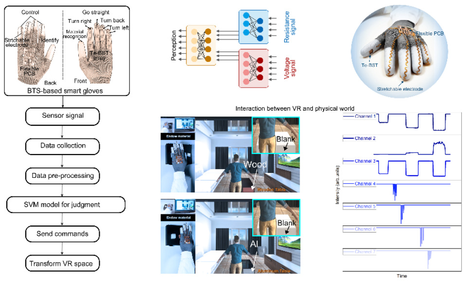 此外,他们还将器件集成到手套上,通过带入神经网络算法,实现了不同材料和材质的准确识别。并将其引入虚拟现实场景,将现实世界中的物体映射到虚拟世界中,解决了目前 VR 手套主要是控制方向功能的弊端。