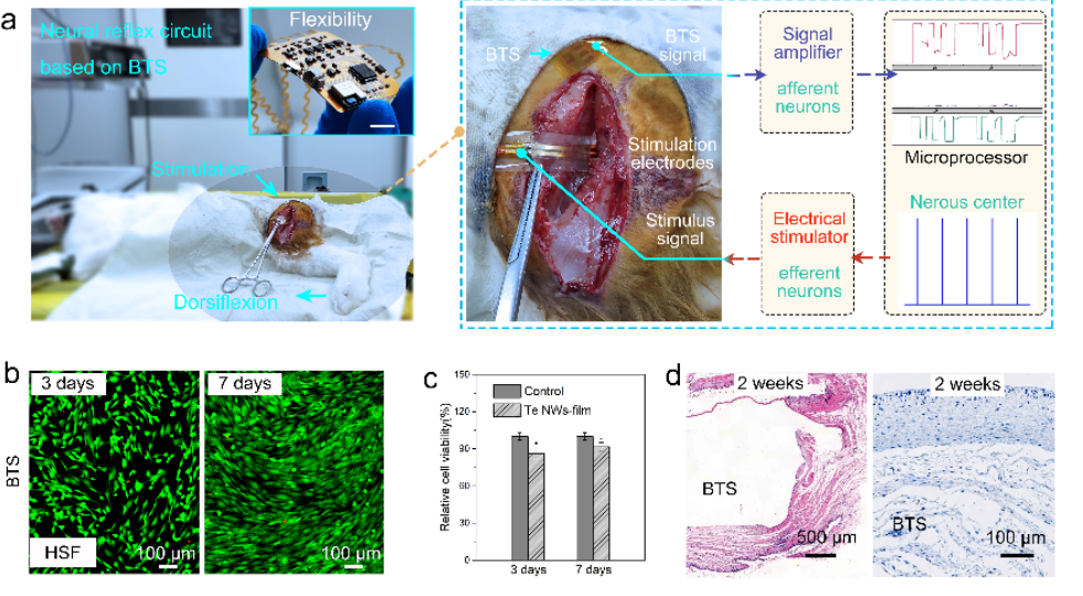 当将器件与柔性电极相连,即可构成触觉神经反馈系统,实现其在精准医疗领域的潜在应用。