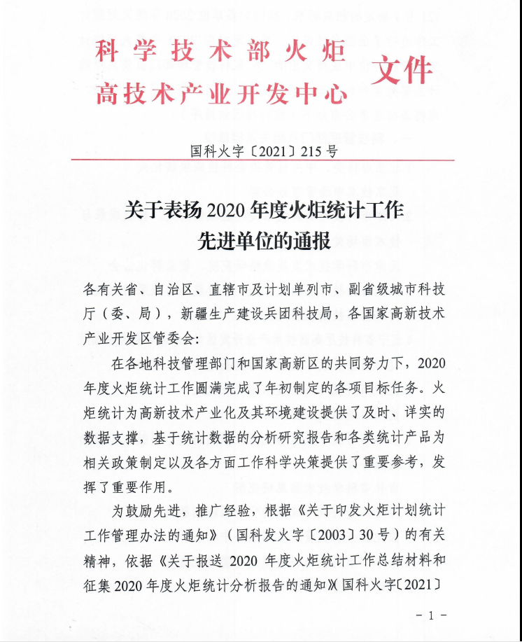 12月29日,全国火炬统计工作线上培训班公布了2020年度火炬统计工作先进单位,对火炬统计工作成绩突出的高新区予以表彰,烟台高新区光荣上榜。
