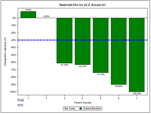 本次公布的ACE-Breast-03研究数据只包括了7例患者的治疗数据。疗效方面,在对T-DM1耐药或无反应的患者中,接受ARX788治疗的患者的确认ORR为57.1%(4/7名患者),DCR为100%(7/7名患者)。