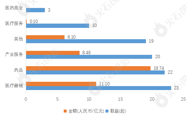 本月药品领域最为吸金,融资金额高达19.74亿元,占总融资金额的43.37%。从项目数量上看,医疗器械领域也较为活跃。