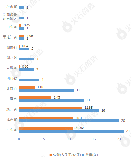 本月融资项目主要分布在广东省(21起)和江苏省(20起)。从融资金额来看,浙江省最为突出,融资金额高达12.65亿元,占总融资金额的27.78%;其次,广东省也较为突出,融资金额高达10.88亿元,占总融资金额的23.90%。