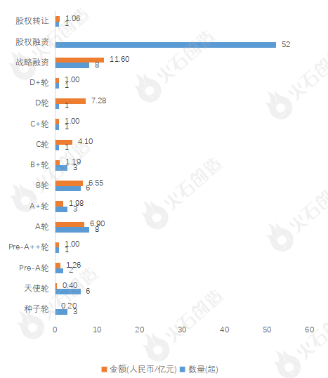 从融资轮次上看,本月融资事件大多集中股权融资,共有52个项目获投。从融资金额来看,战略融资获得最高融资金额11.60亿元,占总体融资金额的25.48%;其次,D轮也获得了较高融资金额7.28亿元,占总体融资金额的15.99%。
