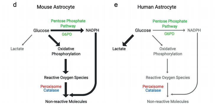 氧化应激 (oxidative stress) 是在很多神经系统疾病中导致细胞死亡的元凶。作者首先比较了人和小鼠的星状胶质细胞对氧化应激的耐受力。尽管人和小鼠在很多方面大同小异,出人意料的是,人和小鼠的星状胶质细胞对氧化应激的耐受力有天壤之别。人的星状胶质细胞比小鼠的更容易因为氧化应激而死亡。作者进一步深入研究了为什么会有这样的不同,他们发现小鼠的星状胶质细胞比人的表达更高的抗氧化解毒基因。氧化应激对神经退行性疾病的病情发展至关重要。很多年来,科学家发现神经退行性疾病的小鼠模型往往比病人的症状更轻微,但是他们并不清楚为什么会这样。现在作者发现小鼠的星状胶质细胞更能在氧化应激中存活,这可能是小鼠模型症状更轻的原因之一。这个发现指出了一个改进小鼠疾病模型的方法:减少小鼠星状胶质细胞中抗氧化解毒基因的表达,就可以让这些细胞更接近人的星状胶质细胞的状态,这样改良的小鼠疾病模型有望帮助科学家发现有临床价值的神经系统疾病新疗法。