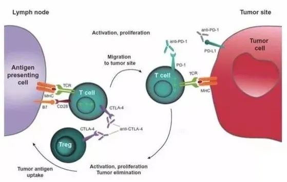 从机制上看,在T细胞激活阶段,PD-L1单抗通过阻断PD-L1与B7-1的结合,可以增强T细胞的启动和活化,CTLA4单抗可以解除抑制T细胞活化的信号,维持T细胞的激活状态。在效应阶段,PD-L1单抗通过阻断PD-L1与PD-1的结合,可以激活被抑制剂的T细胞,CTLA-4单抗则可解除肿瘤微环境中Treg细胞(调节性T细胞)的免疫抑制状态,使复活的效应T细胞迅速杀伤肿瘤细胞。