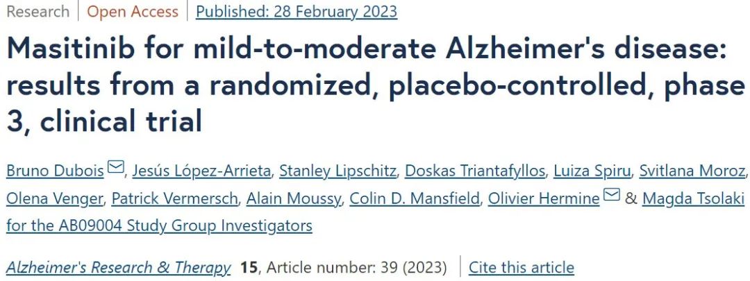 [2] Dubois, Bruno et al. “Masitinib for mild-to-moderate Alzheimer's disease: results from a randomized, placebo-controlled, phase 3, clinical trial.” Alzheimer's research & therapy vol. 15,1 39. 28 Feb. 2023, doi:10.1186/s13195-023-01169-x