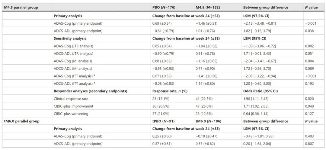 分析显示,在ADAS-Cog评分的主要终点上,马赛替尼相对于安慰剂可以产生显著的治疗效果。与基线相较,马赛替尼组患者(n=182)与安慰剂组患者(n=176)的ADAS-cog评分变化分别为-1.46(代表认知总体改善)和+0.69(代表认知恶化增加),两组患者的ADAS-cog分数差异为-2.15(97.5% CI:-3.48,-0.81,p=0.0003),此差异被认为具有临床意义。此外,在ADCS-ADL评分上,与安慰剂相比,马赛替尼产生了总体功能改善的非显著性趋势。具体而言,马赛替尼组患者ADCS-ADL分数较基线的变化为+1.01(代表整体功能改善),安慰剂组为-0.81(代表功能恶化增加);两组患者的ADCS-ADL差异为+1.82(97.5% CI:-0.15,3.79,p=0.038)。