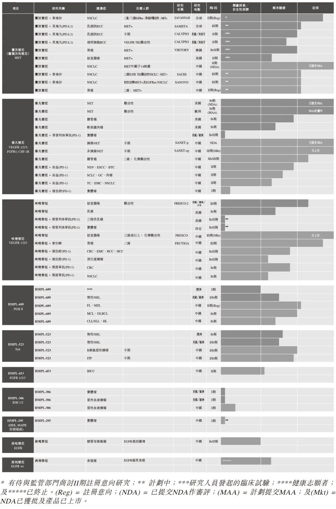 现阶段,和黄医药有十种处于临床阶段的候选药物,七种处于临床前试验阶段的肿瘤及免疫候选药物,涵盖MET、VEGFR、FGFR、CSF-1R、PI3Kδ、Syk、IDH、ERK及EGFR等多个创新靶点及已验证靶点,为研发出更安全有效的新药奠定了基础。该公司正在全球开展及计划开展超过40项不同的临床研究,仅2021年年底前就将有10项3期临床或2期临床项目在全球推进。