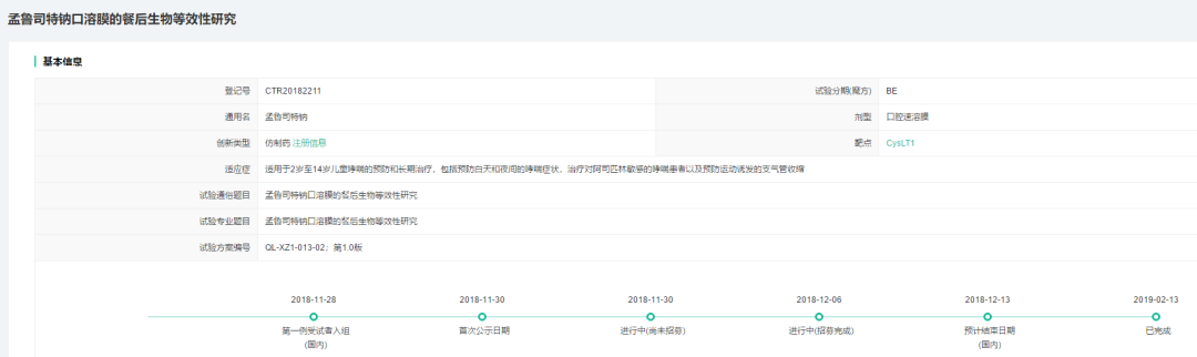 由齐鲁登记BE研究信息可知,齐鲁开展口腔速溶膜BE研究所选参比为默沙东生产的孟鲁司特钠咀嚼片(顺尔宁,5mg)。登记的适应症为用于2岁至14岁儿童哮喘的预防和长期治疗,包括预防白天和夜间的哮喘症状,治疗对阿司匹林敏感的哮喘患者以及预防运动诱发的支气管收缩。由此可知,该款口腔速溶膜是针对儿科患者的又一个新剂型。