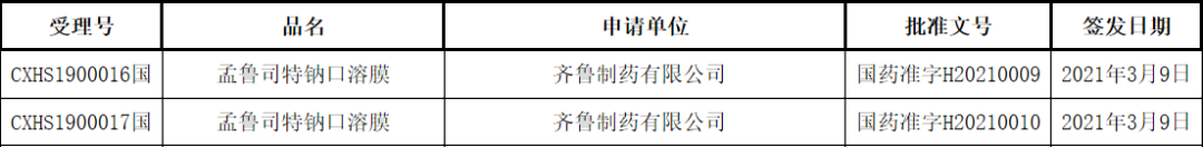 今日,国家药监局官网显示,齐鲁制药按2.2类申报的孟鲁司特钠口腔速溶膜已获NMPA批准上市。