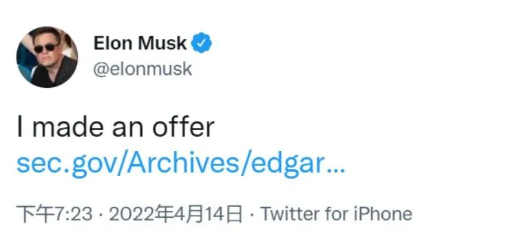 几天后,4 月 14 日,马斯克提出将收购 Twitter。