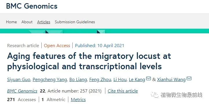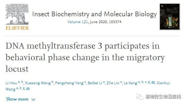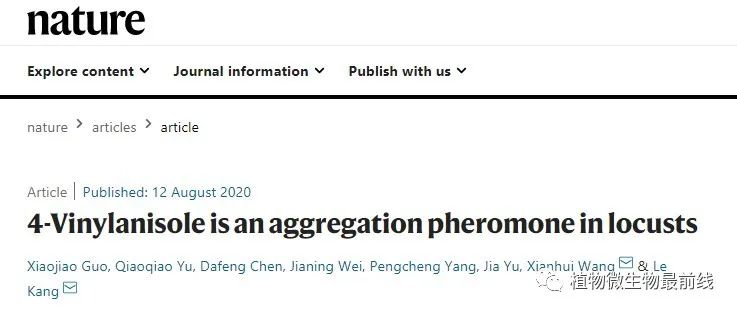 人类对蝗虫聚群成灾的认识经历了几个重要突破。首先是尤瓦洛夫(Uvarov,1921)提出的著名的蝗虫型变理论。该理论提出之后,先后在世界上发现大约有10种最具危险性的蝗虫都有型变现象。第二个重要突破是英国科学家辛普森(Simpson)领导的团队在上世纪90年代建立的沙漠蝗群居型与散居型行为判别模式和生理学特征。第三个重要的突破是来自于中国科学院康乐院士团队,他们从2004年起,开启了蝗虫型变基因表达调控和表观遗传调控的分子机理研究。现在,他们又发现了飞蝗群聚信息素,揭示了飞蝗群聚的奥秘。这一发现具有重要的理论意义与应用价值,进一步推动了国际蝗虫领域的研究。该研究工作以“4-vinylanisoleis an aggregation pheromone in locusts”为题,于2020年8月12日正式在Nature发表(doi: 10.1038/s41586-020-2610-4),该研究得到了中国科学院先导专项、国家基金委重点项目等项目的大力支持。