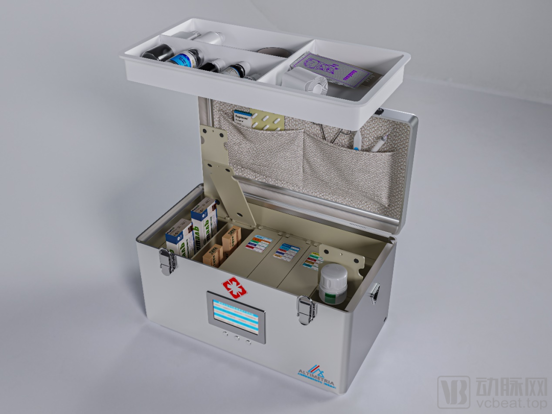 图:得录智能药箱,以存放常见慢病患者一个月药量并免拆包装作为设计标准,实现分品种的提醒、引导及记录,兼具家庭药箱功能