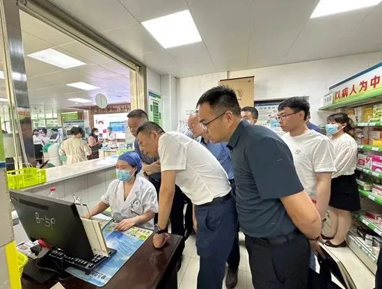 △ 调研组一行在麓谷街道社区卫生服务中心药房,观看前置审方系统对药品进行审核