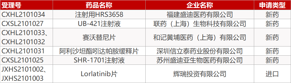 福建盛迪的注射用HRS3658、联药(上海)的UB-421注射液、和记黄埔的赛沃替尼片(2个规格)、深圳信立泰的阿利沙坦酯吲达帕胺缓释片、苏州盛迪亚的SHR-1701注射液。