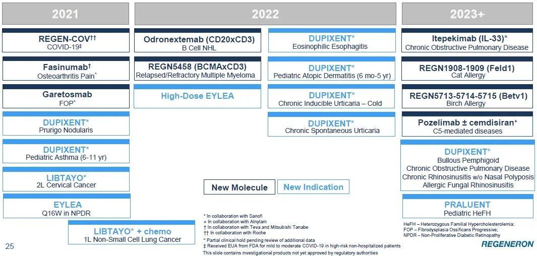 再生元与赛诺菲(Sanofi)建立了深入的战略合作伙伴关系,陆续上市了PCSK9单抗Praluent®(alirocumab)、IL-4Rα单抗Dupixent®(dupilumab)、IL-6单抗Kevzara®(sarilumab),以及PD-1单抗Libtayo®(cemiplimab)。再生元还与拜耳(Bayer)合作开发了抗VEGF融合蛋白Eylea®(aflibercept),两者分别美国/美国以外地区的销售权。对于新冠中和抗体鸡尾酒疗法REGEN-COV®,美国以外市场由罗氏(Roche)以商品名商品名Ronapreve®进行销售,再生元从中获取部分收益。