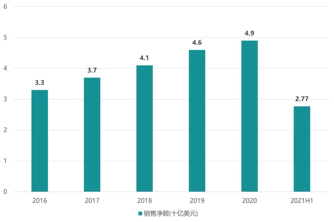因为精准面向大量未被满足的临床需求,Dupixent在全球市场高歌猛进,2017~2019年销售额分别为2.47亿美元、8.73亿美元和23亿美元,迅速成长为一款重磅炸弹药物,展现出惊人的市场爆发力。Evaluate Pharma在2018年预测了特应性皮炎创新疗法在2024年的销售额,其中Dupixent以51亿美元高居榜首。Duxipent不负众望,2020年全球销售额同比增长70.4%,达到40.33亿美元,成为赛诺菲的当家花旦。2021Q2,Duxipent的全球销售额为14.99亿元,同比增长59%,预计2021年即可提前3年达到Evaluate Pharma的预期。