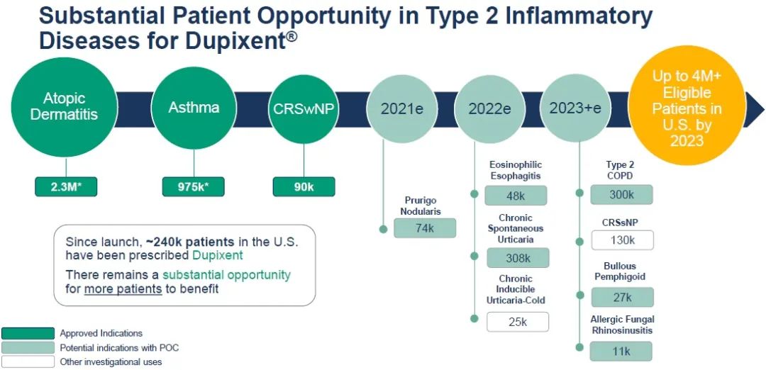 在2021年及未来,Dupixent预计将陆续获批结节性痒疹(PN)、嗜酸性细胞性食管炎(EoE)、慢性荨麻疹(CSU)、2型炎症慢性阻塞性肺病(COPD)、大疱性类天疱疮(BP)、变应性真菌性鼻-鼻窦炎(AFRS)、慢性诱导寒冷性荨麻疹、无鼻息肉的慢性鼻窦炎(CRSsNP)等8个适应症,在美国市场的增量患者群体还有92.3万人。