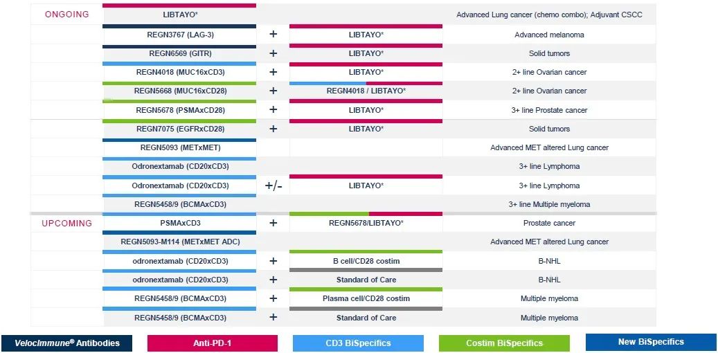 再生元建立了专有技术平台VelocImmune®,使用独特的基因人源化小鼠来生产优化的全人源抗体和双抗。对于单抗,靶点有PD-1、LAG-3、GITR、CTLA-4。双抗包括三类:(1)包含CD3靶点的BiTE,另一靶点为CD20、BCMA、MUC16;(2)共刺激双抗,靶点为PSMA、EGFR、MUC16;(3)新型双抗,包括METxMET、PiGs、VelociNator®。单抗与单抗、单抗与双抗、双抗与双抗,都可以开发单药疗法或者组合疗法,用于治疗血液瘤(B细胞非霍奇金淋巴瘤、多发性骨髓瘤、淋巴瘤)和实体瘤(肺癌、卵巢癌、前列腺癌)。