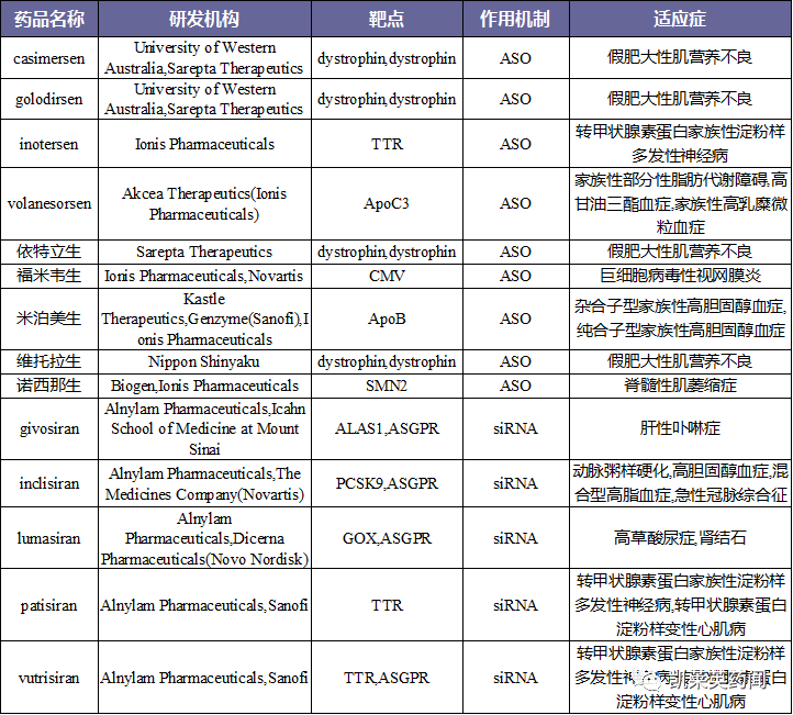 ASO和siRNA目前是小核酸药物领域的热点赛道,siRNA 虽然起步相比ASO 较晚,但凭借其更高的效率和长效性吸引了更多企业的关注。目前,小核酸药物行业整体具有较高景气度、良好竞争格局、较大潜在市场规模的特性,它的机会在于:1)理论上可以靶向任何基因,伴随技术持续进步,具有涵盖所有疾病领域的潜力;2)相比现有的小分子和抗体药物具有长效、高效和设计简单等优势,有望能够取代现有疗法,实现治标治本;3)具有较高技术和专利壁垒,因此行业竞争格局较好,玩家相对较少,且具有先发优势。目前,全球已获批9款ASO和5款siRNA。
