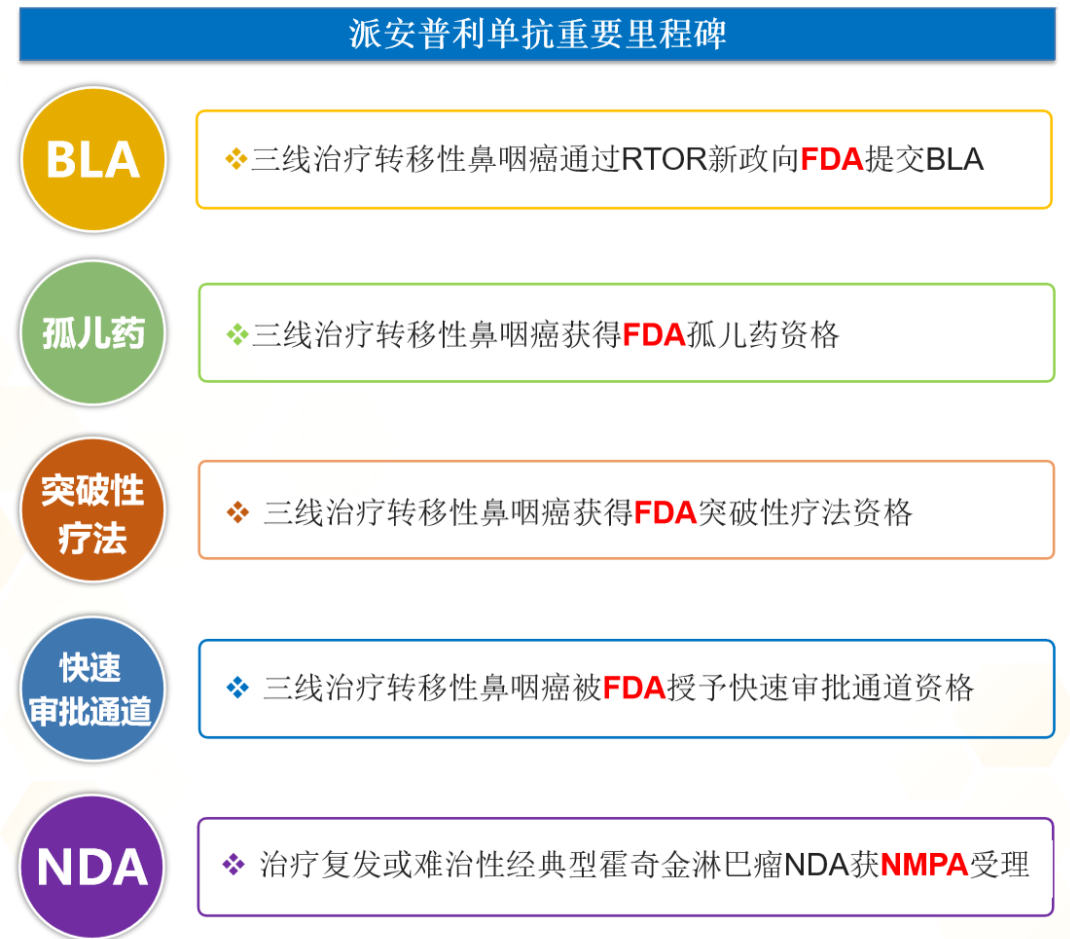 这是派安普利单抗继三线治疗转移性鼻咽癌通过RTOR新政成功在美国提交BLA,以及治疗至少经过二线系统化疗复发或难治性经典型霍奇金淋巴瘤成功在中国提交NDA后,成功提交的第三个上市申请。此前,派安普利三线治疗转移性鼻咽癌已获FDA授予突破性疗法认定、孤儿药资格认定以及快速审批通道资格。