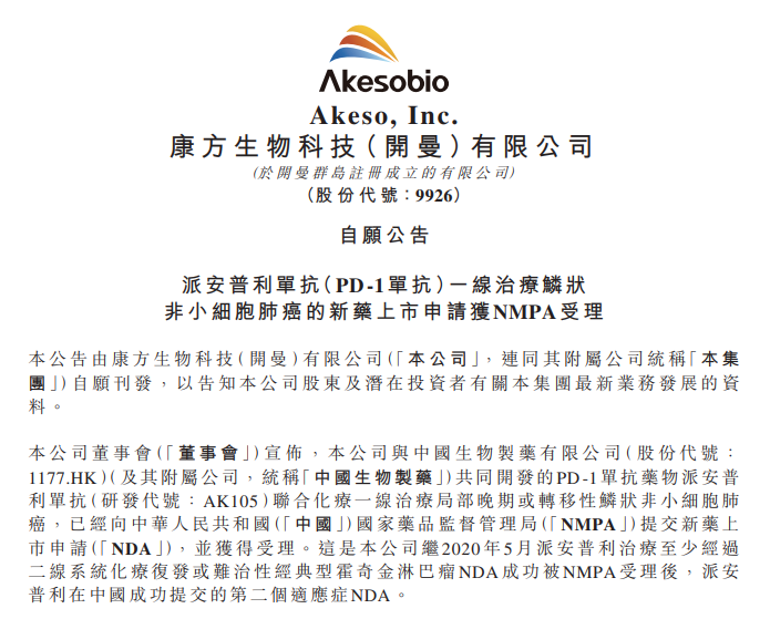 7月2日,康方生物发布公告,称已经向国家药监局(NMPA)提交其与中国生物制药共同开发的PD-1单抗药物派安普利单抗联合化疗一线治疗局部晚期或转移性鳞状非小细胞肺癌新适应症上市申请,并获得受理。