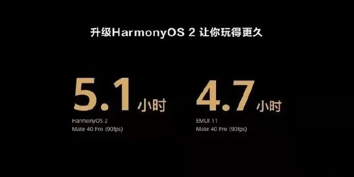 比如用搭载HarmonyOS 2的Mate40 Pro玩《和平精英》,续航时间可达5.1个小时相比采用EMUI的相同机型续航时间提升了24分钟。