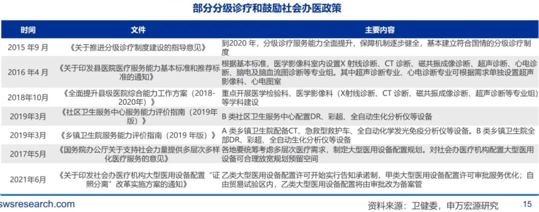 社会办医:随着各项利好政策的不断落地,社会办医疗机构高端大型医疗设备配置审批放松,促进了大型医疗设备市场的扩增。