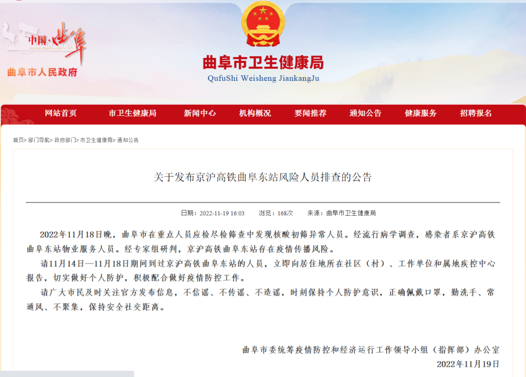 请11月14日—11月18日期间到过京沪高铁曲阜东站的人员,立即向居住地所在社区(村)、工作单位和属地疾控中心报告,切实做好个人防护,积极配合做好疫情防控工作。