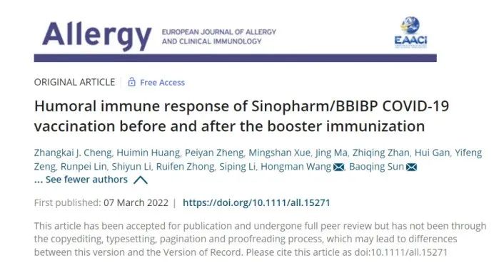该研究题为《Humoral immune response of BBIBP COVID-19 vaccination before and after the booster immunization》,于当地时间3月7日发表于国际学术期刊《Allergy》。呼吸疾病国家重点程章恺博士、黄惠敏、郑佩燕、薛明汕为本研究的共同第一作者,孙宝清教授为通讯作者。