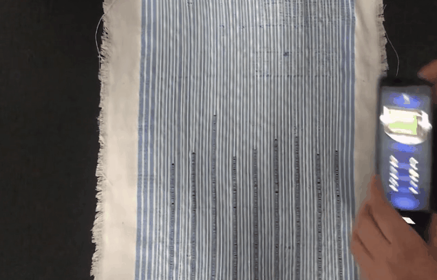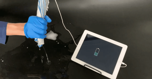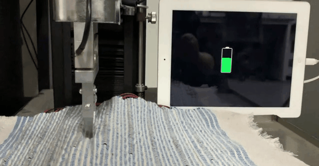 用纤维锂离子电池做成的衣服正在给手机进行无线充电