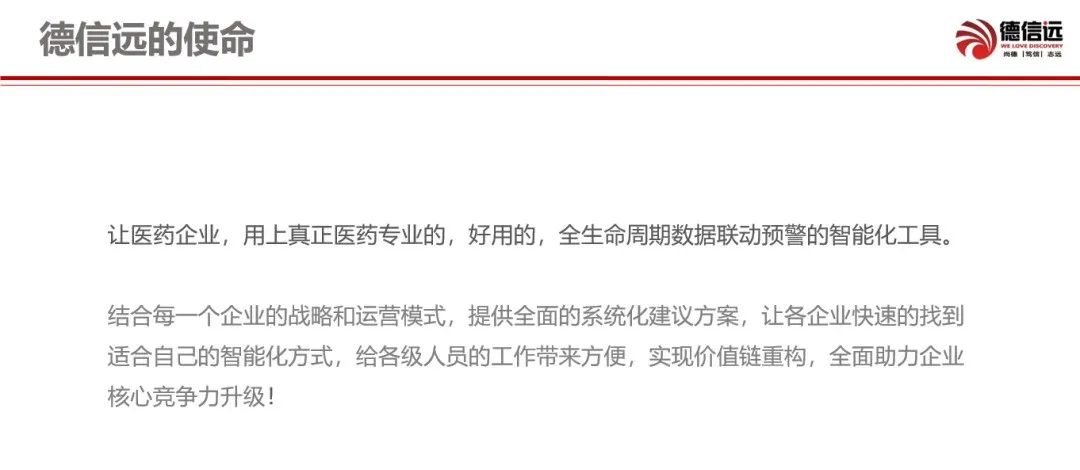 德信远团队专注服务医药领域智能化,为医药领域提供全生命周期智能预警级系统,产品功能包含全产业链,实现医药专业的全生命周期一体化数据联动分析。