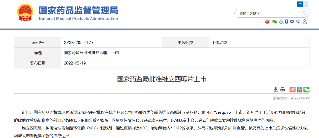 5月19日,国家药品监督管理局通过优先审评审批程序批准拜耳公司申报的1类创新药维立西呱片(商品名:唯可同/Verquvo)上市。该药适用于近期心力衰竭失代偿经静脉治疗后病情稳定的射血分数降低(射血分数<45%)的症状性慢性心力衰竭成人患者,以降低发生心力衰竭住院或需要急诊静脉利尿剂治疗的风险。